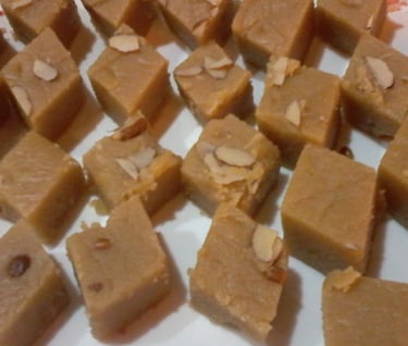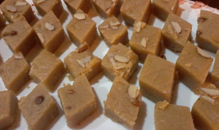 This dessert made of almond, sugar and ghee melts in your mouth. It is cut to diamonds and if you carry a piece with you even if you miss lunch you won't feel hungry.