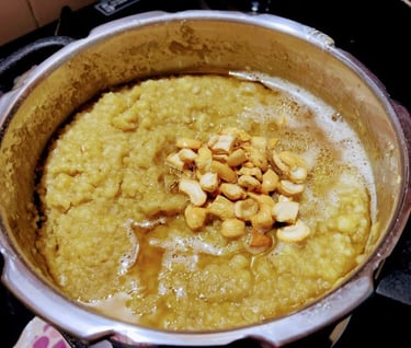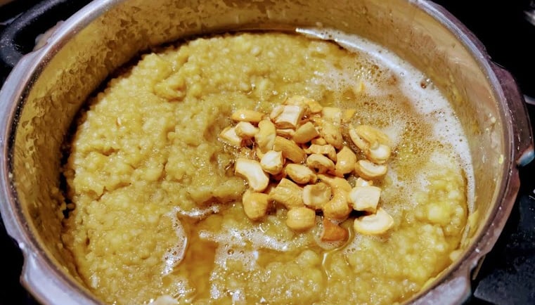 Along with the other ingredients used for garnishing, nutmeg is also powdered and added for this dish. This gives a special flavour which is typical for Sakkarapongal .