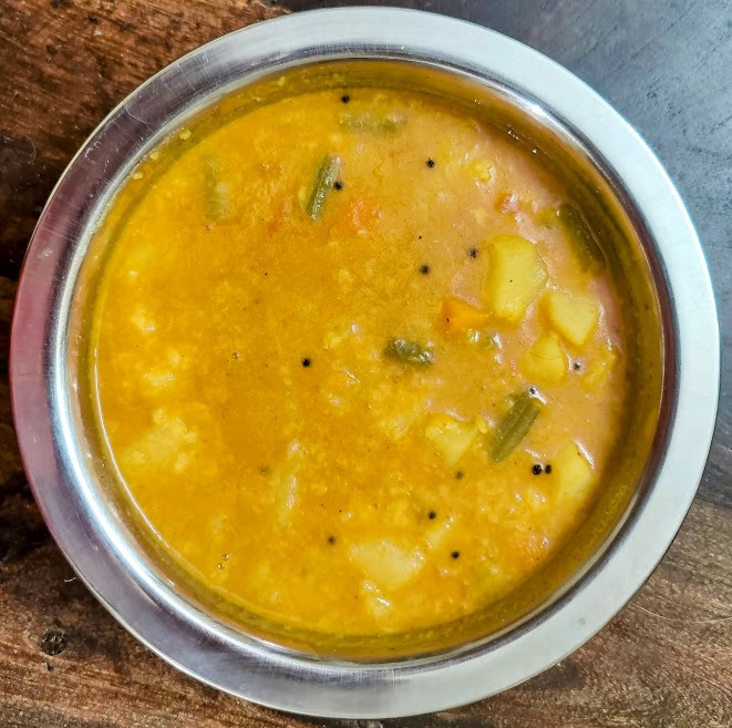 Sambar is made with dal and vegetables. Any vegetable can be used for preparing Sambar. You can use just one vegetable or a combination of three, four or five vegetables.